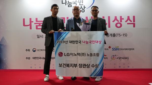 대한민국 나눔국민대상은 국내외에서 다양한 형태로 나눔을 실천한 기업과 개인을 매년 발굴해 인적나눔, 물적나눔, 생명나눔, 희망멘토링 4개 부문으로 포상하는 상이다. LG이노텍 노동조합은 지역사회에 관심을 갖고 다양한 사회공헌 활동을 적극 추진하여 지역복지 발전과 나눔문화 확산에 기여한 바를 인정받아 보건복지부 장관상 수상의 영광을 안았다.