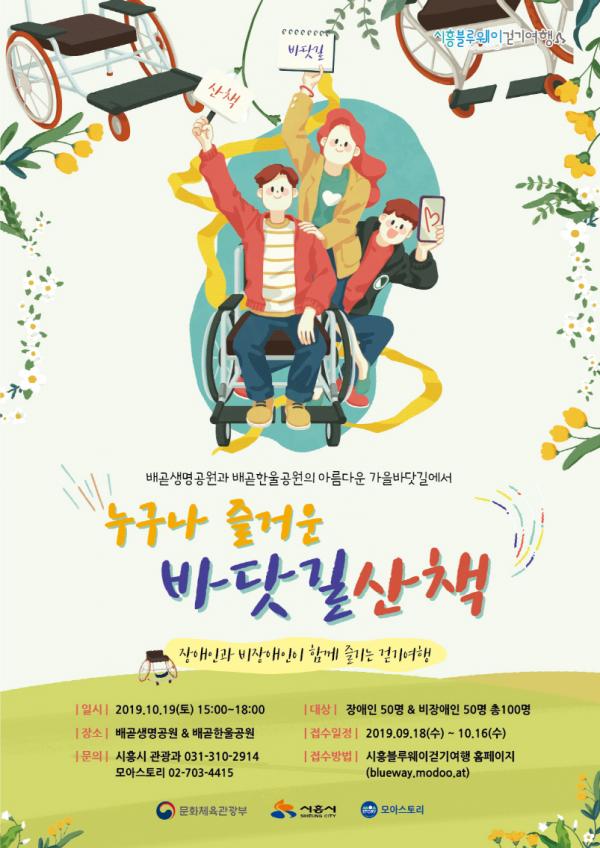 ‘누구나 즐거운 걷기여행’은 문화체육관광부 공모사업인 코리아둘레길 활성화 프로그램인 ‘시흥블루웨이 걷기여행’의 행사다. 장애인과 비장애인이 함께 배곧한울공원의 수변산책로를 따라 걷는 무장애 걷기 행사로 배곧신도시의 아름다운 자연경관과 다양한 체험을 즐길 수 있는 3km 걷기 프로그램이다.