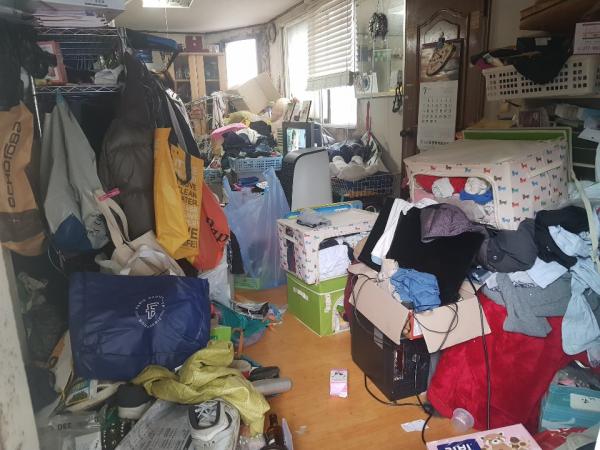 이 어르신의 집은 화분, 의류, 오물 등이 잔뜩 쌓여 방문도 닫히지 않을만큼 열악한데다 함께 살고 있는 아들은 거동이 불편해 청소도 힘들었다.