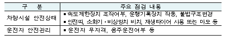 단풍산행, 학생단체 현장체험학습 등 가을철 나들이에 많이 이용되는 전세버스를 대상으로 교통안전에 필수적인 속도제한장치 정상작동, 불법 구조변경 등 안전기준 준수 여부와 함께 좌석안전띠 정상작동 및 소화기·비상망치 비치 적정여부 등을 점검할 예정이며, 특히, 무자격 운전자, 음주운전 여부, 속도제한 준수 및 휴식시간보장과 같은 근로시간 준수 등에 대해 집중적으로 점검하고, 전세버스 대형 교통사고에 대한 경각심을 가지고 예방하기 위해 운행 중 휴대폰 사용 및 대열운행 등 안전운행을 방해하는 행위 금지 등 운송사업자 및 운수종사자 준수사항을 전파할 계획이다.