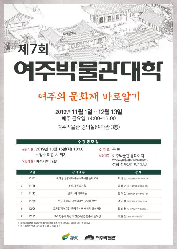 제7회 여주박물관대학은 ‘여주의 문화재 바로알기’라는 주제로 오는 11월 1일부터 12월 13일까지 매주 금요일 오후 2시에 여주박물관 여마관 3층 강의실에서 진행될 예정이다.
