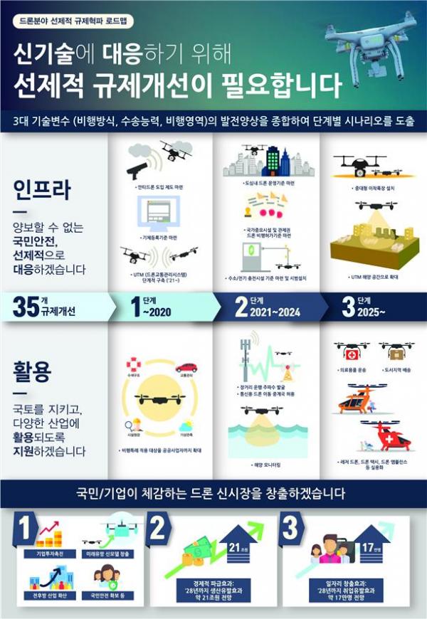 지난해 범부처 드론 해커톤을 시작으로, 드론 산업 발전 심포지엄 개최 및 산·학·연·관 협의체를 구성하여 분야별 신사업 모델을 발굴, 미래산업 상용화 시기를 예측하였으며, 현실 적용가능성을 높이기 위해 공청회, 업계 간담회 및 20여 차례에 걸친 관계부처 및 분야별 전문가 검토를 거쳐 업계·학계의 의견을 수렴·반영해서 마련한 것이다.