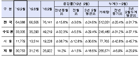 2019년 9월 수도권 거래량은 전년동월 대비 32.3% 감소, 지방은 14.2% 증가하였으며, 2019년 9월 누계 기준, 수도권 거래량은 전년동기 대비 31.2% 감소, 지방은 6.9% 감소했다.