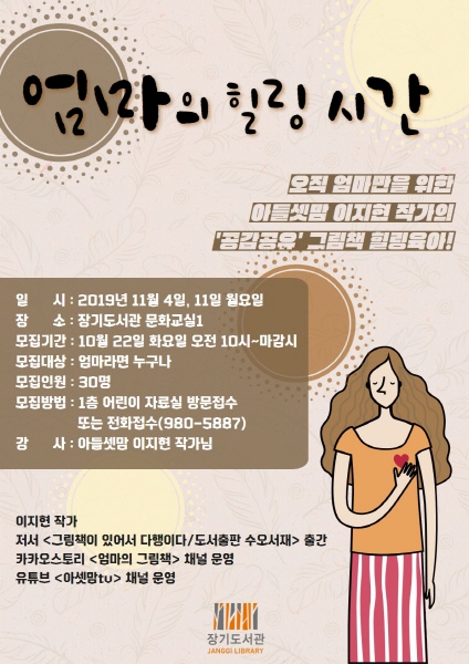 이번 강좌는 카카오스토리 ‘엄마의 그림책’의 운영자이며, ‘그림책이 있어서 다행이야’의 이지현 저자가 그림책을 통해 육아에 지치고 자존감이 떨어진 엄마들을 위로하고 격려하는 내용으로 진행된다.
