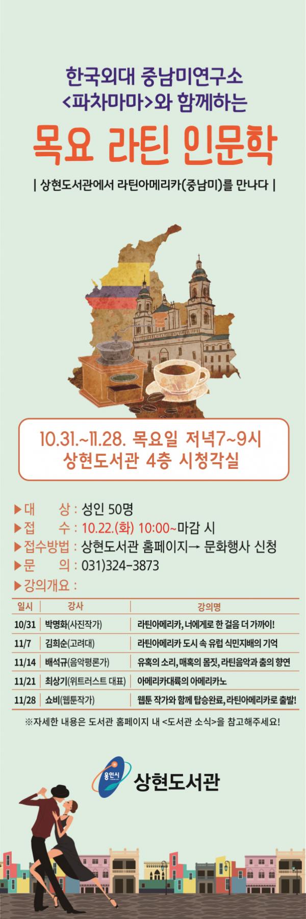 시 관계자는 “한국외대 중남미연구소가 들려주는 5가지 주제의 흥미로운 라틴문화 특강에 많은 주민들이 참여해 인문 소양을 넓히기 바란다”고 말했다.
