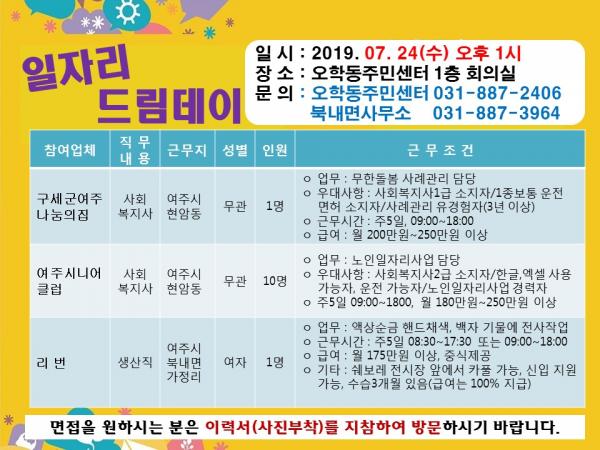 구직을 희망하는 사람은 신분증·이력서·증명사진을 지참해 24일 오후 1시까지 오학동 주민센터 1층 회의실로 방문하면 된다.