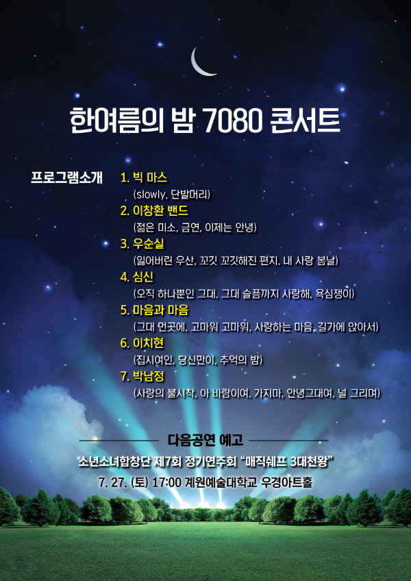 이번 콘서트는 7080 시대를 풍미했던 인기 가수들이 출연해 그 시절의 그리운 추억을 회상하는 즐거운 음악을 선사한다.