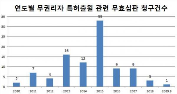무권리자의 특허출원 관련 무효심판 96건의 결과를 살펴보면, 66건이 기각됐고, 30건이 인용되어 무효로 판단됐다.