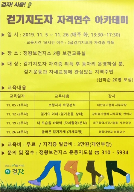 보건소 관계자는 “걷기지도자 자격연수를 통해 주민들이 건강리더로 성장할 수 있는 기회가 되고, 지역사회의 걷기 실천율이 향상되도록 함께 노력하는 길잡이가 될 수 있길 기대한다” 고 말했다.