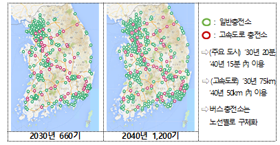 장기적으로는 ’30년까지 누적 660기를 구축하여 주요 도시에서 20분 內, 고속도로에서 75km 內 충전소 이용이 가능하도록 배치하고, ’40년에는 누적 1,200기를 구축하여 이를 15분, 50km 이내로 단축할 예정이다.