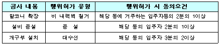 지금까지 세대구분형 공동주택을 설치하는 경우 대수선, 비 내력벽 철거 및 설비증설 등 공사행위별로 동의요건이 서로 다르고, 각각 행위허가를 신청해야 했다.