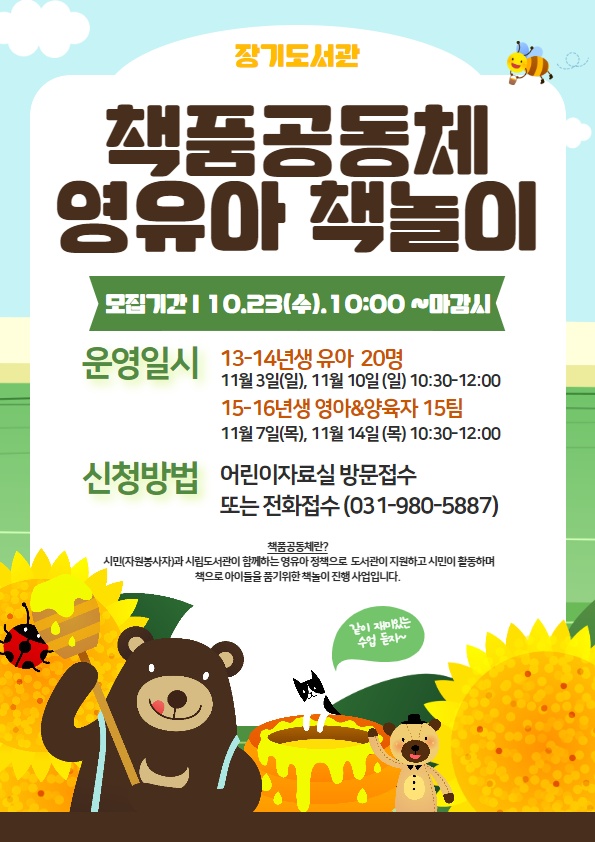 접수방법은 23일 10시부터 장기도서관 어린이자료실에서 방문 또는 전화로 접수 할 수 있다.