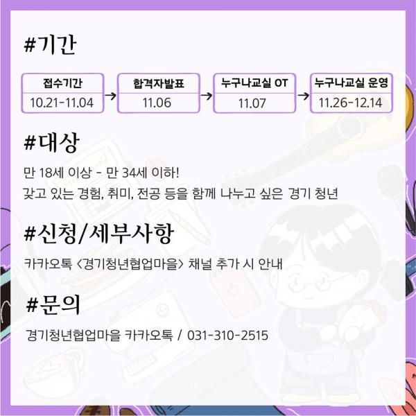 이번 사업은 만 18세 이상 만 34세 이하 강의콘텐츠가 있는 경기도 청년이면 누구나 신청할 수 있으며, 실행가능성 및 적정성을 중점으로 평가할 예정이나 강의경력은 필수가 아니다.