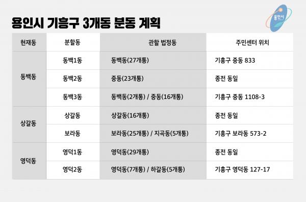 이에 따르면 ?동백동은 동백1, 동백2, 동백3동으로 ?상갈동은 상갈동, 보라동으로, ?영덕동은 영덕1, 영덕2동으로 각각 분동된다.