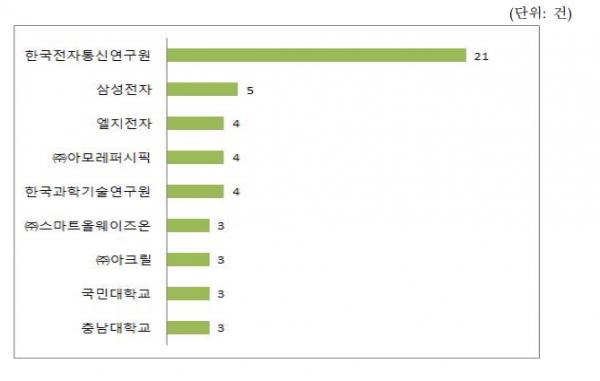 다출원인을 살펴보면 한국전자통신연구원 21건, 삼성전자 5건, 엘지전자, ㈜아모레퍼시픽 및 한국과학기술연구원은 4건, ㈜아크릴, ㈜스마트올웨이즈온, 국민대학교 및 충남대학교는 3건 순이다.