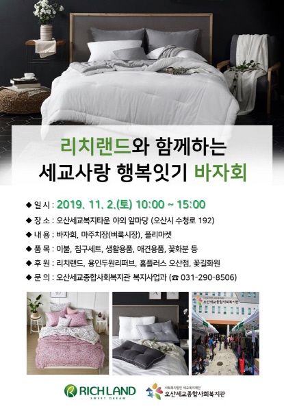 본 행사는 리치랜드 외 용인두원리퍼브, 홈플러스 오산점, 꽃길화원 등이 후원하는 이불, 침구세트, 생활용품, 소가전, 꽃화분 등을 판매하고 지역주민들이 직접 참여하는 마주치장과 플리마켓 등 다양한 물품으로 풍성한 바자회가 될 예정이다.