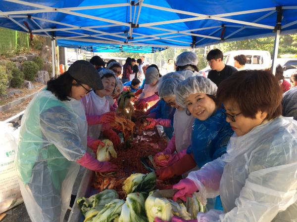 이날 새마을부녀회, 주민자치위원회, 통장협의회 등 6개 민간단체 회원과 자원봉사자 등 50여명은 동 주민센터 앞 마당에서 10kg짜리 100박스 분량의 김치를 담갔다.