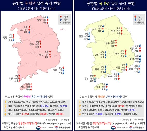 공항별로는 제주·김포·김해·청주·여수공항 등이 증가했고, 울산·인천·광주공항은 감소했다.