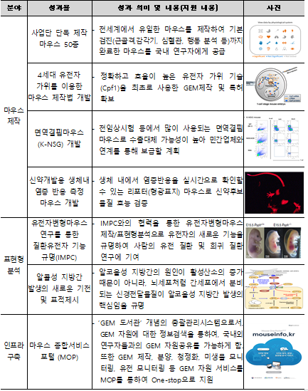 사업단은 세계 최초로 4세대 유전자 가위를 이용한 마우스 유전자 편집 기술을 확보하고, 연구자들이 필요로 하는 신규 마우스 모델 70종을 제작, 제공했다. 뿐만 아니라 비만 및 대사, 시각·청각·후각과 같은 질환들을 마우스에 발현시키고 질환 발병·개선 정도를 정량적으로 확인하는 분석 기술을 서비스로 제공함으로써 국내 연구력을 크게 향상 시켰다.
