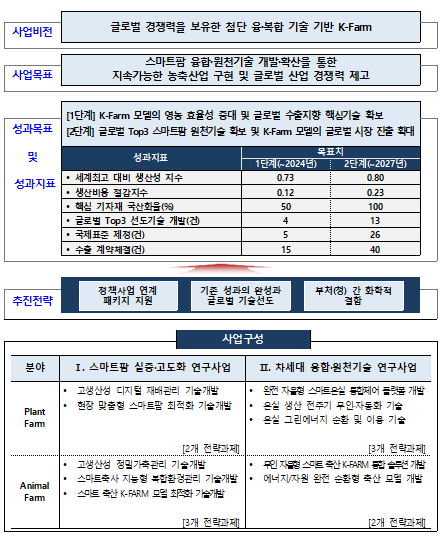 기존 스마트팜 R&D가 농업 편의성 제고를 위한 1세대 스마트팜 개발에 집중한 것과 달리 이번 사업은 데이터 기반의 지능형 의사결정을 통해 저투입·고효율의 안정적 농축산물 생산이 가능한 스마트팜을 구현하고자 한다.