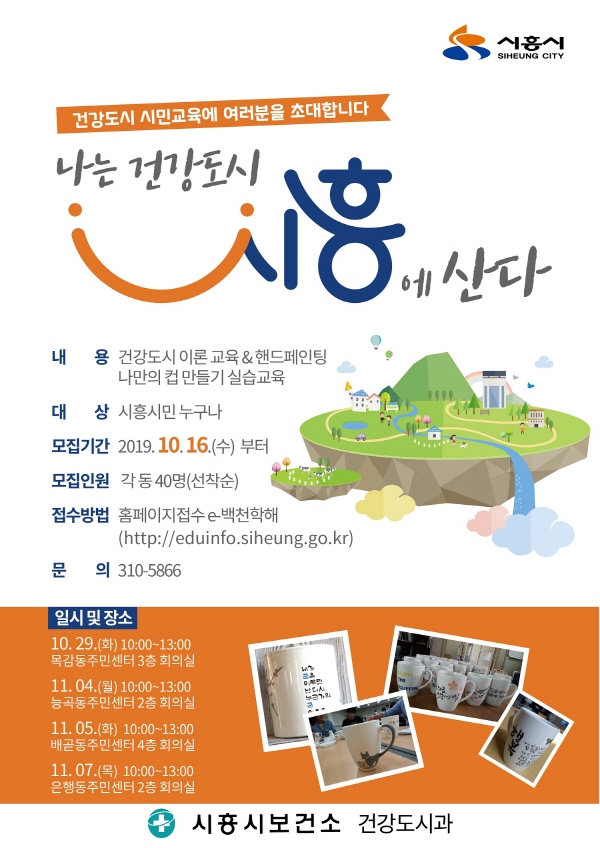 어렵고 막연한 건강도시의 개념을 시민들에게 명쾌히 설명해 시민의 인식개선을 돕고, 시민이 직접 핸드페인팅 기법을 이용해 건강도시의 염원을 담은 글과 그림을 새기는 나만의 컵만들기 체험 수업도 진행한다.