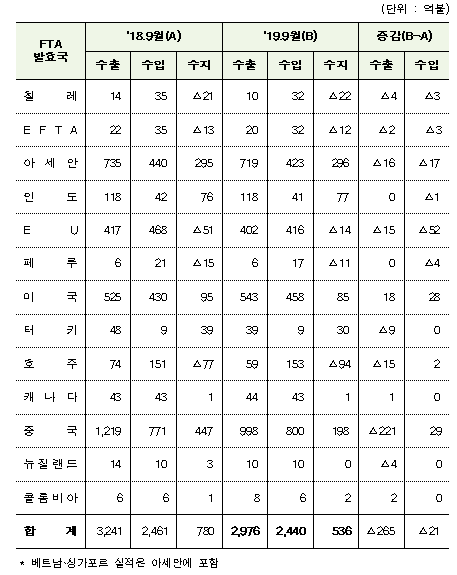 2019년 3/4분기 현재 FTA 발효국과의 교역액은 수출 2976억불, 수입 2440억불로 전년동기 대비 4.2% 감소한 전체 5,416억불을 기록했다.