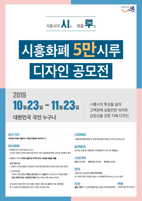 시흥화폐 5만 시루 디자인 시민공모는 전문적인 도안뿐만 아니라 누구나 쉽게 접근할 수 있는 사진, 이미지 등 자유로운 형식으로 대한민국 국민 누구나 참여 가능하며 오는 11월 23일까지 접수한다.