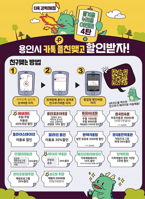 친구 추가를 하면 이들 3곳은 물론이고 한국민속촌과 용인포은아트홀, 짚라인용인 등 용인시내 14개 문화·레저시설을 할인된 가격으로 이용할 수 있다.