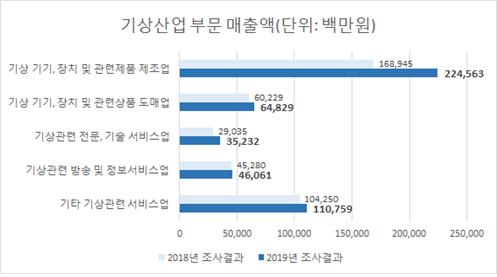 조사에 따르면, 기상산업 부문 총 매출액은 4,814억원으로 2018년 조사결과보다 737억원 증가했다. 이는 ‘기상 기기, 장치 및 관련 제품 제조업’과 ‘기상 관련 전문, 기술 서비스업’의 매출액이 전년 대비 각각 32.9%, 21.3% 순으로 크게 증가했기 때문이다.