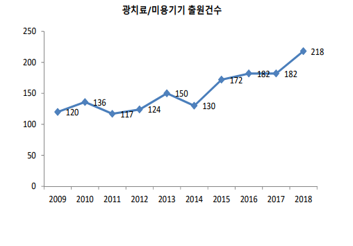 피부대상 기기 중 특히 LED 마스크 관련 특허출원이 크게 증가 했는데, 2014년 이후에는 연평균 39% 증가하고 있는 것으로 나타났다.