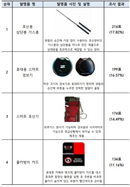 나를 지켜주는 최고의 발명품으로는 전체 유효응답의 17.82%인 214표를 차지한 호신용 삼단봉 가스총이 선정됐다.