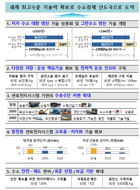 과기정통부와 산업부, 국토부, 해수부, 환경부, 특허청 등 6개 부처와 민간 전문가들이 참여해 마련한 이번 기술로드맵에서는, 각종 분석을 통해 국내 수소 기술의 현 수준을 직시하고 미래 전망을 예측해 국내 실정에 맞는 위한 상세 기술개발 계획을 도출해냈으며 수소 생산, 저장·운송, 활용과 같은 수소 생태계 기본 구성요소 뿐만 아니라, 안전·표준·인증·환경과 같이 이를 뒷받침하는 기반요소들까지 고려함으로써 기술로드맵의 완성도를 높였다.