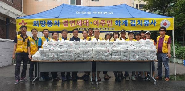 [미디어라이프(medialife)] 용인시 기흥구 신갈동은 대한적십자사 경기지사 신갈청명봉사회가 지난 16일 동 주민센터 앞 광장에서 저소득층을 위한 여름김치 나눔 행사를 가졌다고 밝혔다.