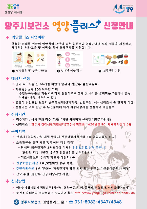 시 보건소 관계자는 “영양플러스 사업이 임산부와 영유아의 식생활 관리능력 향상 등 평생건강의 기초를 다지는 계기가 되길 바란다”며 “건강도시 양주 조성을 위해 최선을 다하겠다”고 말했다.
