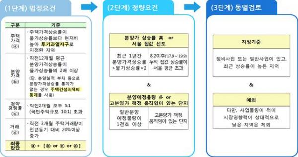 ‘최근 부동산 시장 점검 결과 및 보완방안’을 통해 밝힌 지정 방향과 같이, 최근 분양가격 상승률이 높고 집값 상승세가 지속되고 있어 시장 영향력이 큰 서울을 중심으로 지정 요건 충족 지역을 구 단위로 선별하고 해당 구 내의 정비사업·일반사업 추진 현황, 최근 집값상승률, 고분양가 책정 우려, 시장 영향력 등을 종합적으로 고려해 동 단위로 핀셋 지정하기로 했다.