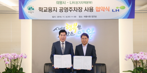이날 협약식은 김상돈 의왕시장과 장충모 LH 경기지역본부장을 비롯한 관계자들이 참석한 가운데 진행됐으며 의왕포일2지구 내 LH공사가 소유한 학교용지를 시에서 무상 임대해 2020년 9월 30일까지 임시 공영주차장으로 활용하기로 협약했다.