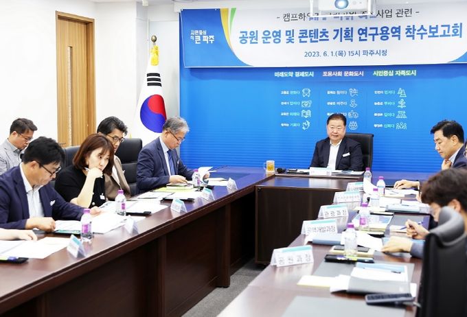 착수보고회는 김경일 파주시장과 관련 국·과장, 파주도시관광공사 관계자 등 20여 명이 참석한 가운데 ▲캠프하우즈 근린공원의 현황과 유사 사례조사 ▲공원 운영 콘텐츠 도출 방안 ▲운영 및 관리 방식 검토 등 용역 추진 방향에 대해 논의했다.