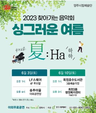 이어 6월 10일 오후 1시와 3시 각각 옥정호수도서관(3층 예술극장)과 회천3동 행정복지센터 어울림마당에서 양주시를 대표하는 양주시립예술단의 무대를 차례로 만나볼 수 있다.