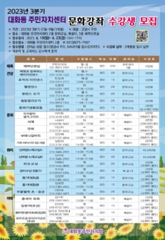이번 문화강좌 모집기간은 오는 6월 19일부터 23일까지이다. 3분기에는 총 23개(체육강좌 1개, 건강강좌 6개, 문화강좌 5개, 취미강좌 7개, 어학강좌 4개)의 다양한 강좌를 운영한다.