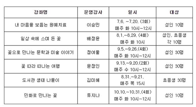 꽃 특성화 도서관인 화정도서관은 7월부터 10월까지 꽃을 소재로 다양한 프로그램을 운영할 예정이다.