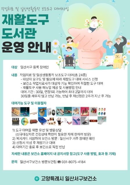 미디어라이프 중부신문 정호복 기자 | 고양특례시 일산서구보건소가 일산서구 등록 장애인을 대상으로 ‘재활도구 도서관’ 사업을 운영한다. 의료기관 방문이 어려운 재가 장애인 등 관내 등록 장애인은 재활도구 도서관에서 작업치료 및 일상생활동작 보조도구를 대여할 수 있다.