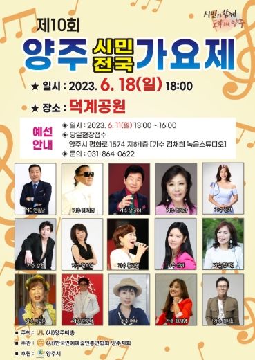 본선은 오는 18일 오후 6시 양주덕계근린공원에서 개최되며 가수 쟈니리, 남일해, 최시라, 향기, 강철 등이 초대가수로 무대에 올라 축하공연을 펼친다.