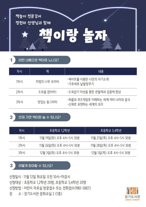 이번 강좌는 초등학교 1~2학년은 오는 19일부터 12월 3일까지 매주 화요일 초등학교 3~4학년은 21일부터 12월 5일까지 매주 목요일에 각 20명씩 4시부터 5시 30분까지 문화교실 2에서 프로그램을 진행한다.
