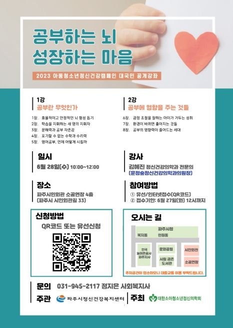 미디어라이프 중부신문 정호복 기자 | 파주시정신건강복지센터에서는 아동·청소년들의 행복한 삶을 위해 지역주민을 대상으로 6월 28일(수) 시민회관 소공연장에서 정신건강 공개강좌를 개최한다.