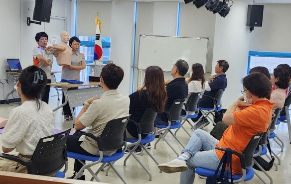 이날 교육은 일산소방서 의용소방대에서 ‘심폐소생술 이론교육’, ‘골든타임의 중요성’, ‘심폐소생술(CPR) 방법’, ‘자동심장충격기(AED) 사용법’ 등으로 진행됐다.