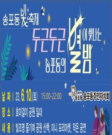 미디어라이프 중부신문 정호복 기자 | 고양특례시 송포동 주민자치회는 오는 6월 10일 오후 3시부터 10시까지 송포동 호미걸이 공원에서 ‘빛축제-두근두근 송포동의 별이 빛나는 밤에’를 개최할 예정이다.