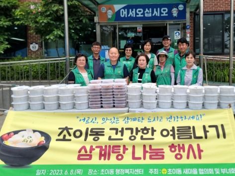 초이동 『건강한 여름나기 삼계탕 나눔 행사』는 초이동 새마을협의회(부녀회)에서 매년 실시하는 행사로 동네 어르신 및 독거노인 등이 더운 여름철을 맞아 건강하게 지내시기를 바라며 이루어지는 행사이다.