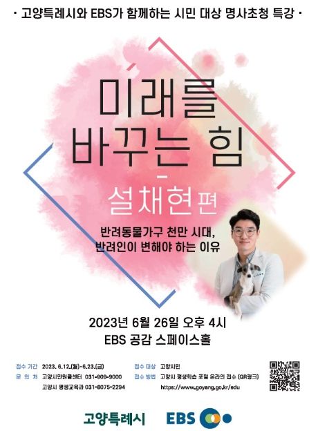 미디어라이프 중부신문 정호복 기자 | 고양특례시와 EBS가 공동으로 기획한 명사초청 특별강연 ‘미래를 바꾸는 힘 설채현 수의사 편 - 반려인이 변해야 하는 이유’를 운영한다. 강연은 6월 26일(월) 16:00에 EBS 공감 스페이스 홀에서 진행된다.