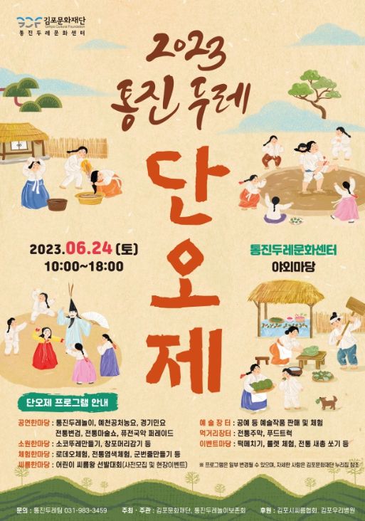‘단오제’는 설·추석과 함께 대표적인 우리 명절 ‘단오’를 기념하기 위해 김포시에서 매년 개최하는 행사로, ‘2023 통진두레단오제’는 지난해와 마찬가지로 김포문화재단과 김포통진두레놀이보존회에서 협력해 올해도 다양한 프로그램을 운영하는 등 풍성한 행사가 열릴 예정이다.
