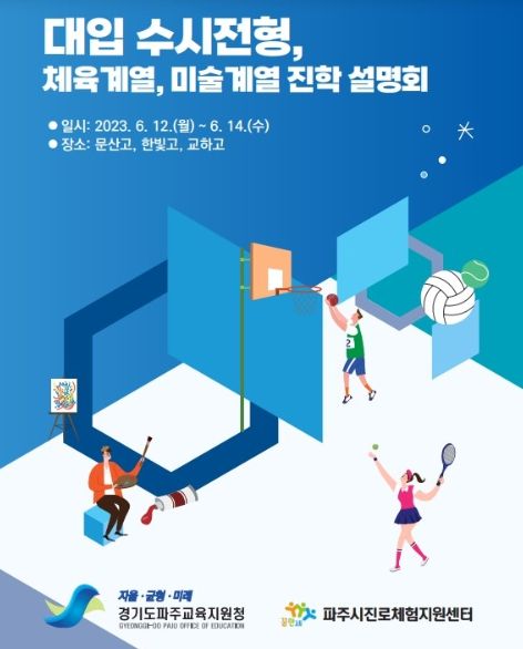 이번 진학 설명회는 파주교육지원청과 파주진로체험지원센터가 공동 주관하는 것으로, 대입진학지도 리더교사들이 중심이 되어 대입 수시전형, 체육계열, 미술계열로 분야를 나누어 3일 동안 진행한다. ▴6월 12일 문산고등학교에서의 수시 전형에 대한 진학 설명회를 시작으로, ▴6월 13일에는 한빛고등학교에서 체육계열 대입 진학 설명회, ▴6월 14일에는 교하고등학교에서 미술계열 대입 진학 설명회를 개최할 예정이다.